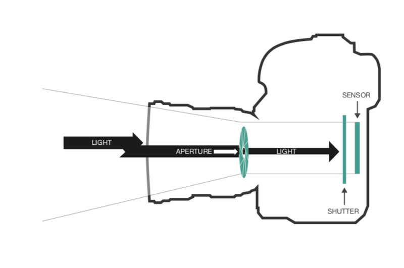 Light enters the lens & into the camera body, how much light enters, is determined by the lens iris (Aperture), it then hits the shutter, which drops down when you depress the shutter button, exposing the light onto the sensor (or in the old days, film) & turning it into an image.